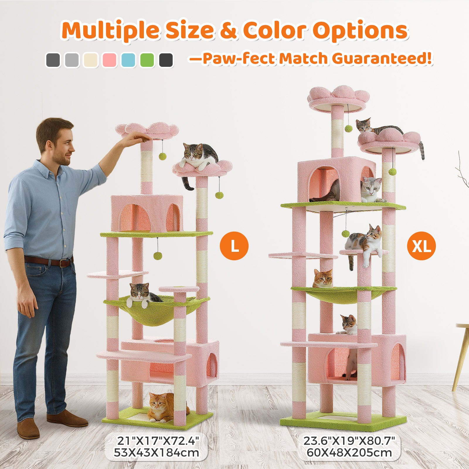 205cm Tall, Endless Climbing Fun: With the total height of 205cm in 8-level structure, the super large cat tree is perfect for 4-5 big cats who love climbing up and down together. The needs of scratching, climbing, sleeping and exercising can also be fully satisfied! Especially the unique rectangle super large cat condo and wide hammock are much larger than normal ones and perfect for cats resting together.