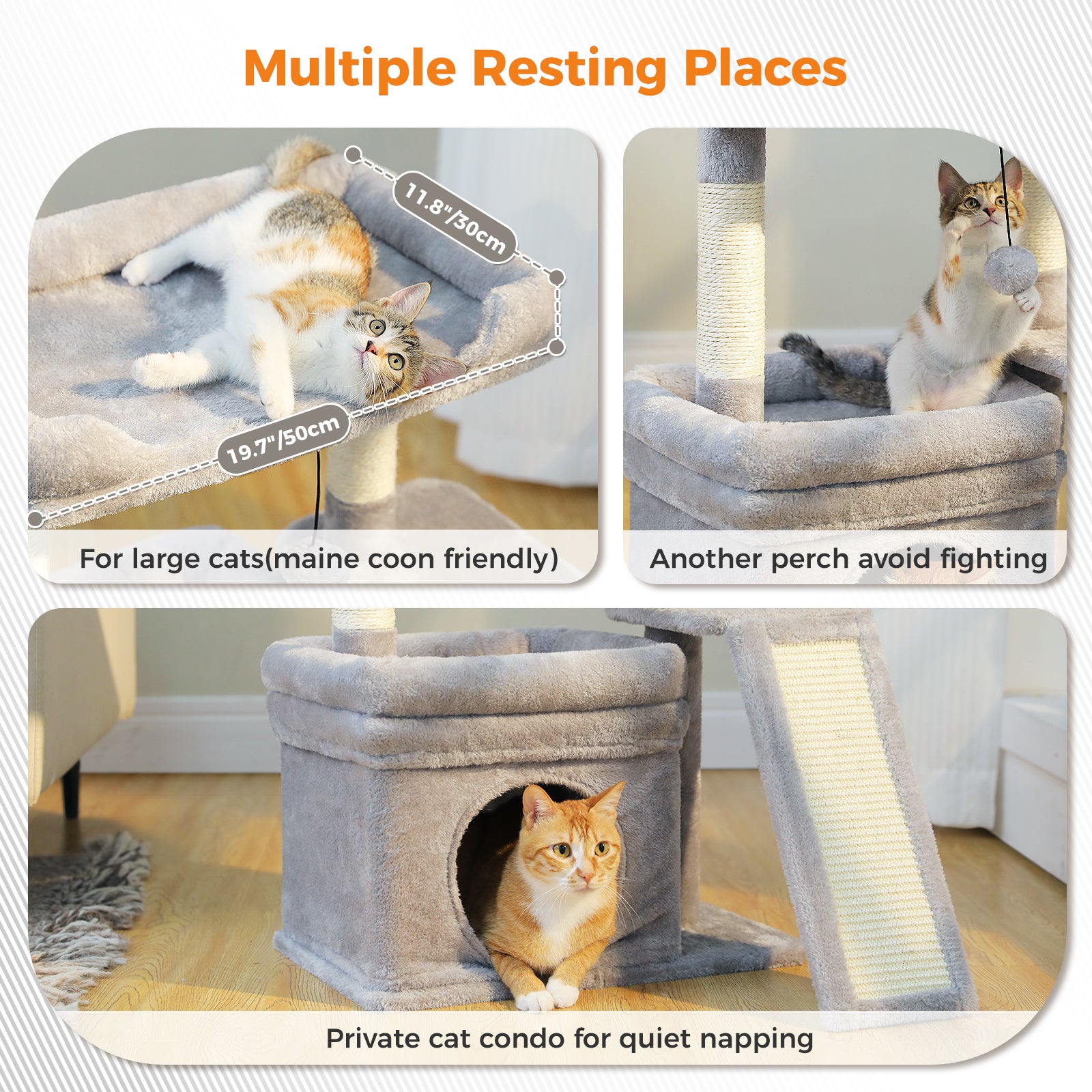 - Fulfill Scratching Needs: Euipped with 2 durable sisal covered scratching posts and a wide sratching pad, your furry friends will get entertainment in an unlimited time. And the cat tower can efficiently keep naughty cats away from your furniture